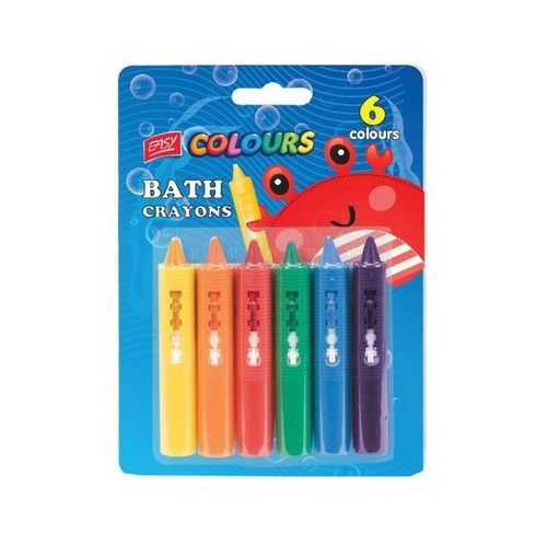 Kredki do kąpieli, w zestawie 6 kolorów. Mogą być stosowane na większości płytek ceramicznych i wannie Nie plamią i nie niszczą powierzchni Łatwe do usunięcia ciepłą wodą Świetne do zabawy podczas kąpieli.