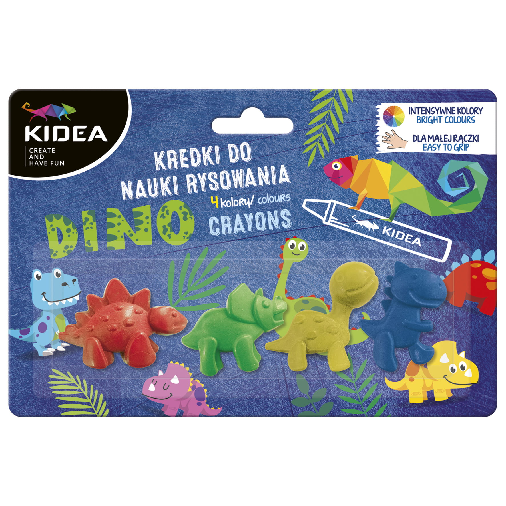 Idealne kredki do nauki rysowania. Już od najmłodszych lat ćwicz razem z KIDEA małą motorykę, która jest odpowiedzialna za precyzję ruchów oraz zręczność. Ergonomiczne kredki, które wymuszają prawidłowy chwyt sprawdzą się doskonale wśród dzieci, które zaczynają przygodę z plastyką. Idealnie ćwiczą mięśnie dłoni, a ich uroczy kształt pobudza wyobraźnię dziecka i zachęca do tworzenia! Poznaj nasze zabawne dinozaury w 4 intensywnych kolorach - żółtym, zielonym, niebieskim i czerwonym. To świetna propozycja dla każdego malucha!
