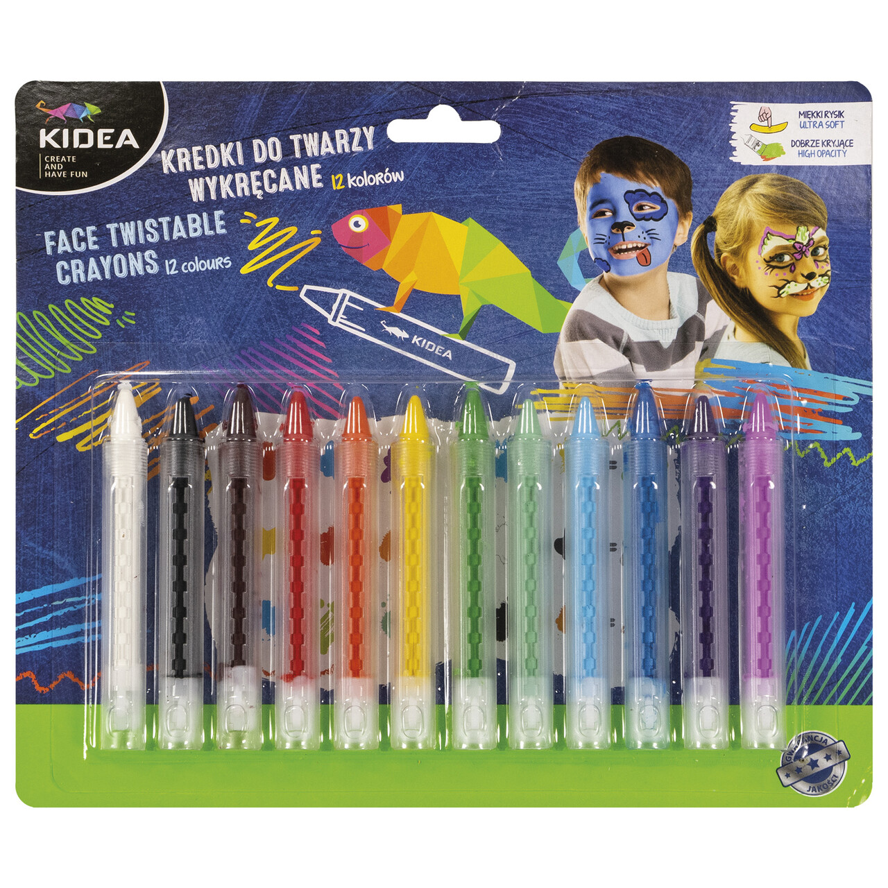 Opakowanie Kredki do twarzy Kidea wykręcane 12 kolorów KDTW12KA