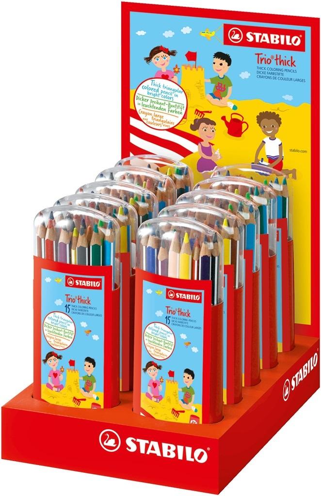 STABILO Trio thick - gruba kredka o ergonomicznym, trójkątnym przekroju stworzona z myślą o dzieciach. Dodatkową zaletą jest bardzo gruby rdzeń o średnicy 4,2 mm odporny na złamania. Intensywne kolory i miękki rdzeń sprawiają, że kolorowanie jest prawdziwą przyjemnością. Kredki dostępne są w 24 kolorach. Opakowanie to plastikowe, sztywne etui z zawieszką zawierające 15 szt.
