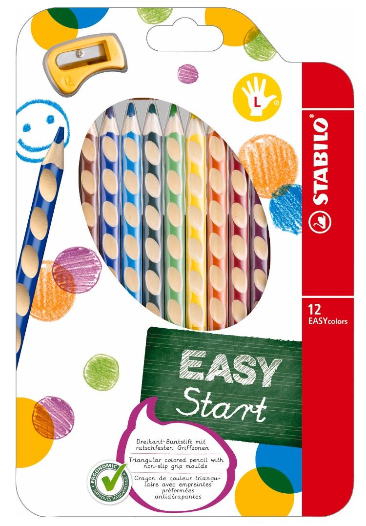 Kredki STABILO EASYcolors dla leworęcznych- etui 12 szt. w komplecie z temperówką dla leworęcznych. Ergonomiczne kredki o trójkątnym przekroju zapewniają wygodny chwyt podczas rysowania. Specjalny kod kolorystyczny umożliwiający rozpoznanie wersji: żółty kolor końcówki dla leworęcznych, czerwony dla praworęcznych. Specjalny lakier zabezpieczający przed brudzeniem strefy uchwytu Nawet po zatemperowaniu palce znajdują wygodną pozycję do trzymania Specjalne miejsce na wpisanie imienia Dostępne w 12 kolorach. Średnica rdzenia 4,5 mm. Posiadają certyfikat PEFC produkt ekologiczny. Posiadają znak bezpieczeństwa CE. Produkty z serii EASYergonomics experts zostały wyróżnion eprzez rodziców i otrzymały oznaczenie ""NAGRODA RODZICÓW 2014"".