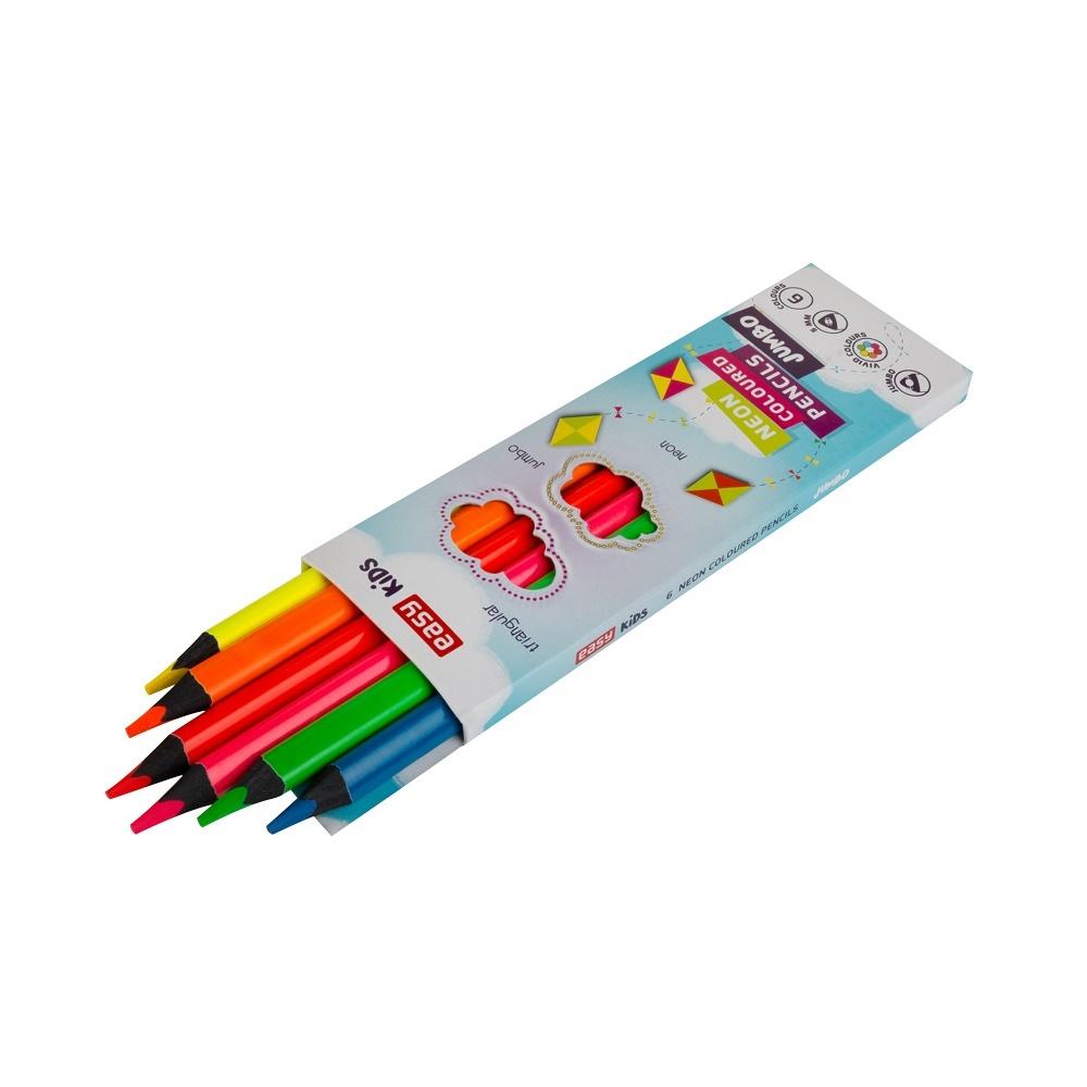 Zestaw kredek trójkątnych wykonanych z naturalnego materiału – drewna. Gama 6 intensywnych, neonowych kolorów.