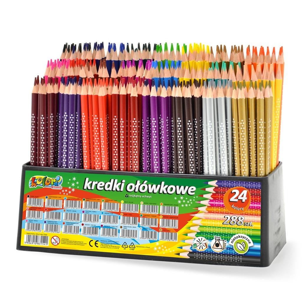 Displej zawierający 288 sztuk kredek w 24 kolorach po 12 sztuk każdego koloru. Trójkątna obudowa, grafit o średnicy 3 mm i zwiększonej odporności na złamania. Nowoczesna formuła pigmentów dająca żywe, niegasnące kolory. Obudowa
