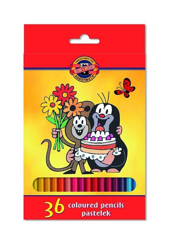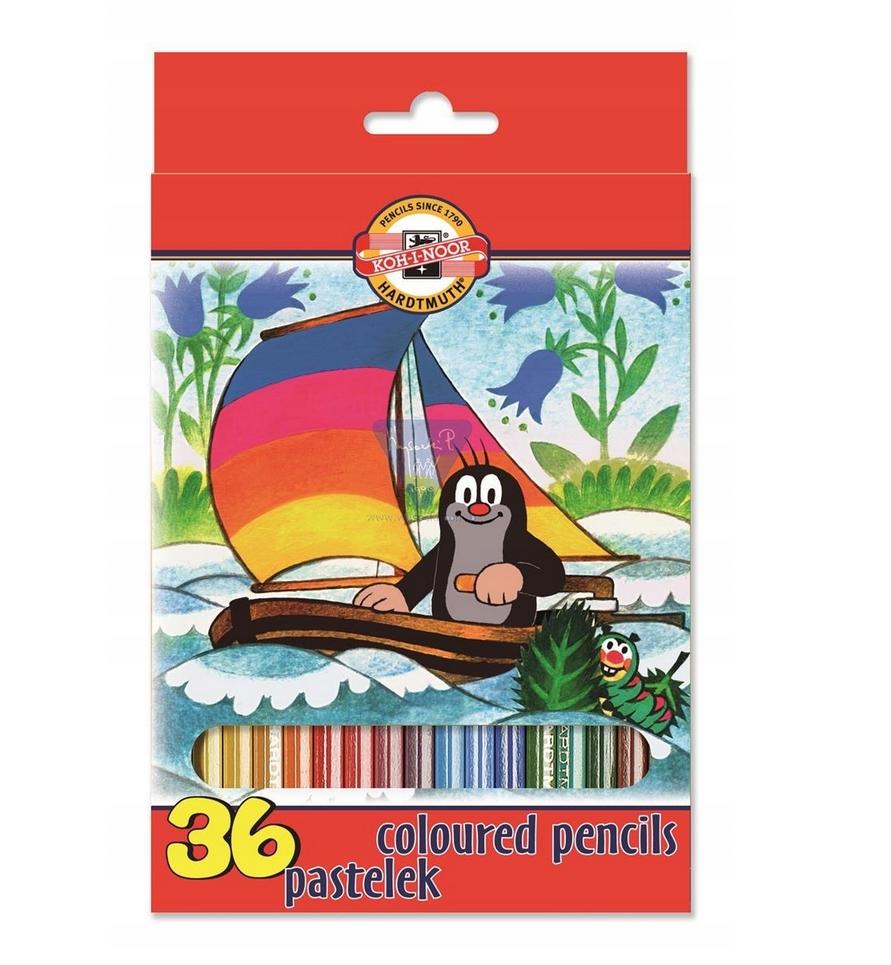 Kredki szkolne KOH-I-NOOR, komplet 36 kolorów posiadają wkład o podwyższonej wytrzymałości na złamania i silny nacisk, jednocześnie zapewniający miękkie i łatwe rysowanie. Dysponują intensywną paletą kolorów. Są bezpieczne dla użytkownika, pozbawione ostrych krawędzi (zaokrąglona końcówka). Wykonane zostały zgodnie z europejskimi normami bezpieczeństwa.