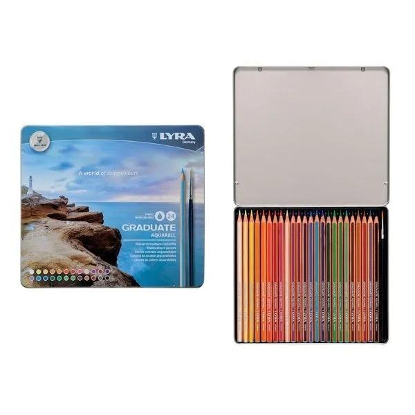 Kredki Lyra Graduate Aquarell 24 kolory w metalowym pudełku. Kredki wysokiej jakości, o średnicy grafitu 3,3 mm, z efektrm akwareli. Wykonane z drewna cedrowego.