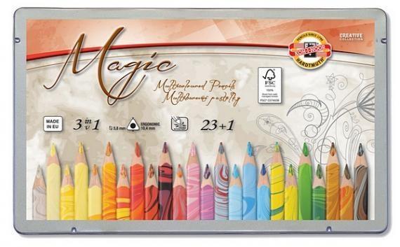 Zestaw 23 kredek, każda z nich zawiera trzy odcienie koloru. W zestawie również blender, który służy do rozcierania przejść pomiędzy kolorami.- 3 kolory w 1 wkładzie;- trójkątny ergonomiczny uchwyt;- 100 % certyfikat FSC