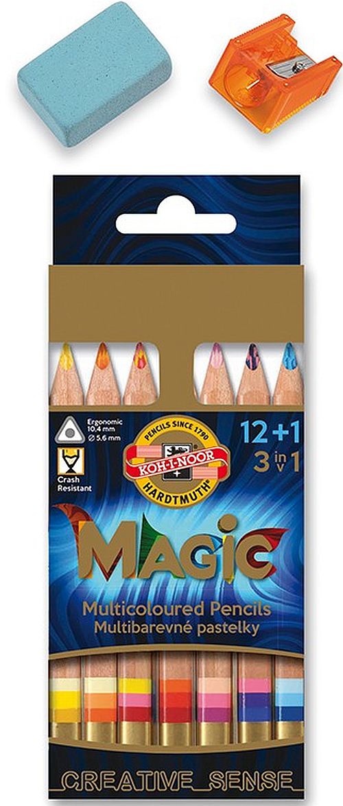 MAGIC TRIO KOH-I-NOOR kredki z efektownym wielokolorowym wkładem. Umożliwiają tworzenie efektownych i niepowtarzalnych prac. Użycie w kredce wkładu trzech odcieni jednego koloru powoduje, że rysunek nabiera charakteru przestrzennego (efekt 3D). Kolor kreski zmienia się w zależności od obrotu, nachylenia, kierunku rysowania i zużycia kredki. Dysponują intensywnymi kolorami, a miękki wkład sprawia, że łatwo się nimi rysuje. Duża średnica wkładu (5,6mm) zapewnia odporność na silny nacisk i złamanie, a gruba trójkątna oprawka (10 mm)wymusza prawidłowe ergonomiczne trzymanie kredki. Do kredek dołączany jest blender, jest to bezbarwna kredka służąca do rozcierana, rozmazywania śladu prowadzenia kredki i mieszania kolorów. Zestaw zawiera 12 szt. kredek krótkich w wersji natur, blender, temperówkę i gumkę.
