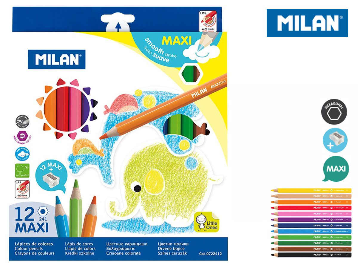 Kredki ołówkowe MAXI sześciokątne z miękkim, Kredki sześciokątne, ołów o średnicy 5,8 mm. System ochrony rysika LPS zwiększający odporność na złamanie.Wysokiej jakości pigmenty w żywych, intensywnych kolorach, odporne na działanie światła. Kreska wykonana kredką MILAN jest miękka, jednolita o wyraźnym odcieniu. Nie tworzy rowków ani nie niszczy papieru. Idealne dla małych dzieci. W zestawie 12 kolorów + temperówka
