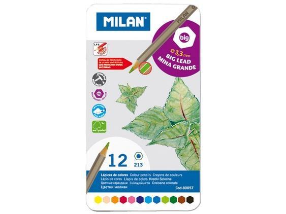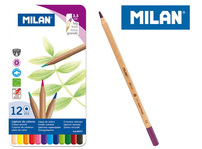 Kredki sześciokątne w metalizowanej oprawie. Ołów o średnicy 3,3 mm, miękki. System ochrony rysika LPS zwiększający odporność na złamanie. Wysokiej jakości pigmenty w żywych, intensywnych kolorach, odporne na działanie światła. Kreska wykonana kredką MILAN jest miękka, jednolita o wyraźnym odcieniu. Nie tworzy rowków ani nie niszczy papieru. 12 kolorów w ekskluzywnym metalowym opakowaniu. Idealne na prezent.