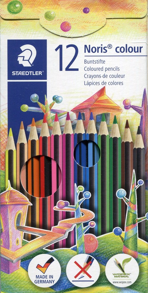 Kredki szkolne Noris 12 kolorów, z dołączonym ołówkiem, temperówką oraz gumką Kredki wykonane w technologii WOPEX. Wysoka odporność na złamania. Ergonomiczna miękka powłoka. Drzewo pochodzące z certyfikowanych lasów w Niemczech (PEFC)