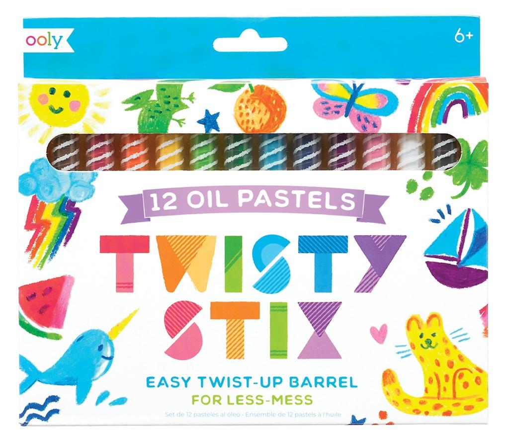 Ooly Twisty Stix to zestaw dwunastu olejnych pasteli w plastikowych oprawkach. Nie brudzą rąk, są łatwe w użyciu, by dostać się do kredki wystarczy ją wykręcić.