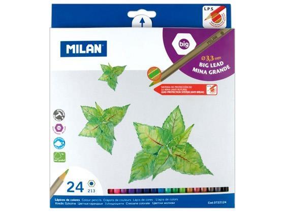 Kredki sześciokątne. Ołów o średnicy 3,3 mm, miękki. System ochrony rysika LPS zwiększający odporność na złamanie. Wysokiej jakości pigmenty w żywych, intensywnych kolorach, odporne na działanie światła. Kreska wykonana kredką MILAN jest miękka, jednolita o wyraźnym odcieniu. Nie tworzy rowków ani nie niszczy papieru.