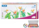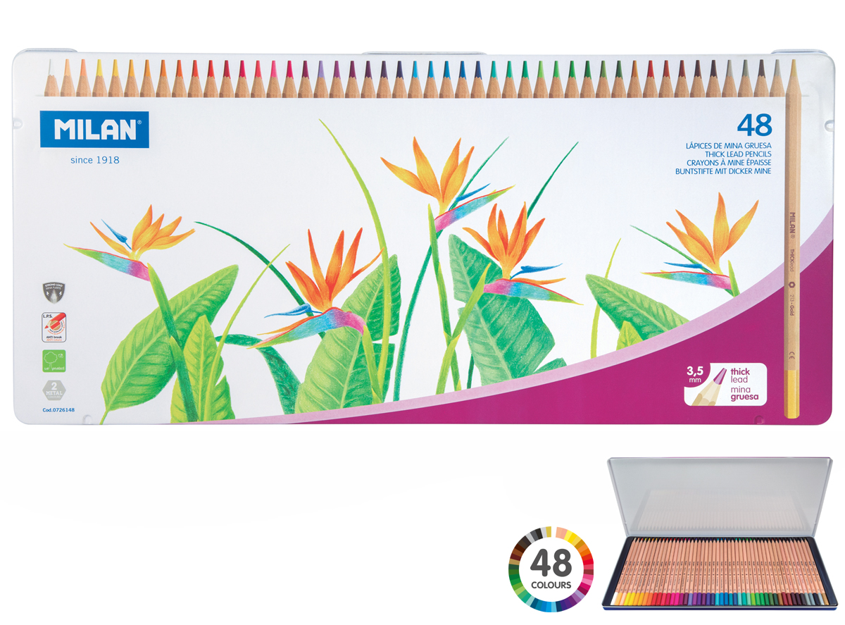 Kredki ołówkowe w 48 intensywnych kolororach, o sześciokątnym przekroju, zapakowane w poręczne metalowe opakowanie.