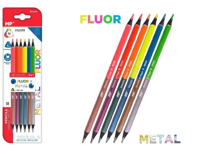 Dwukolorowy ołówek z drewnianym korpusem lakierowanym w kolorze grafitu. Trójkątny, wygodny korpus. Odporny na wstrząsy i ostrzenie ołówek w kolorach fluorescencyjnych i metalicznych do kreatywnych dekoracji i rysunków. Podwójna końcówka: z jednej strony metaliczna, z drugiej fluorescencyjna. Blister zawierający 6 kredek,12 kolorów: 6 metalicznych + 6 fluorescencyjnych.