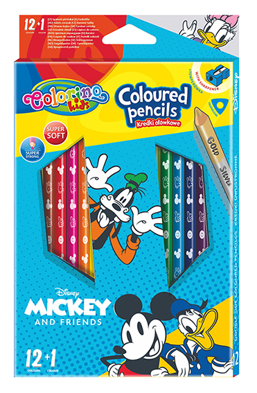 Kredki ołówkowe trójkątne Colorino Kids 13 kolorów 12 sztuk z temperówką Mickey