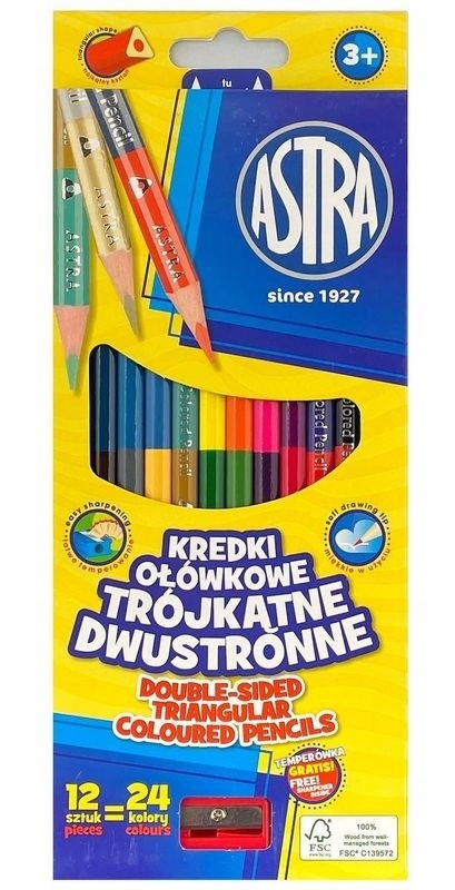 Kredki ołówkowe trójkątne dwustronne Astra 12 szt. 24 kolory z temperówką