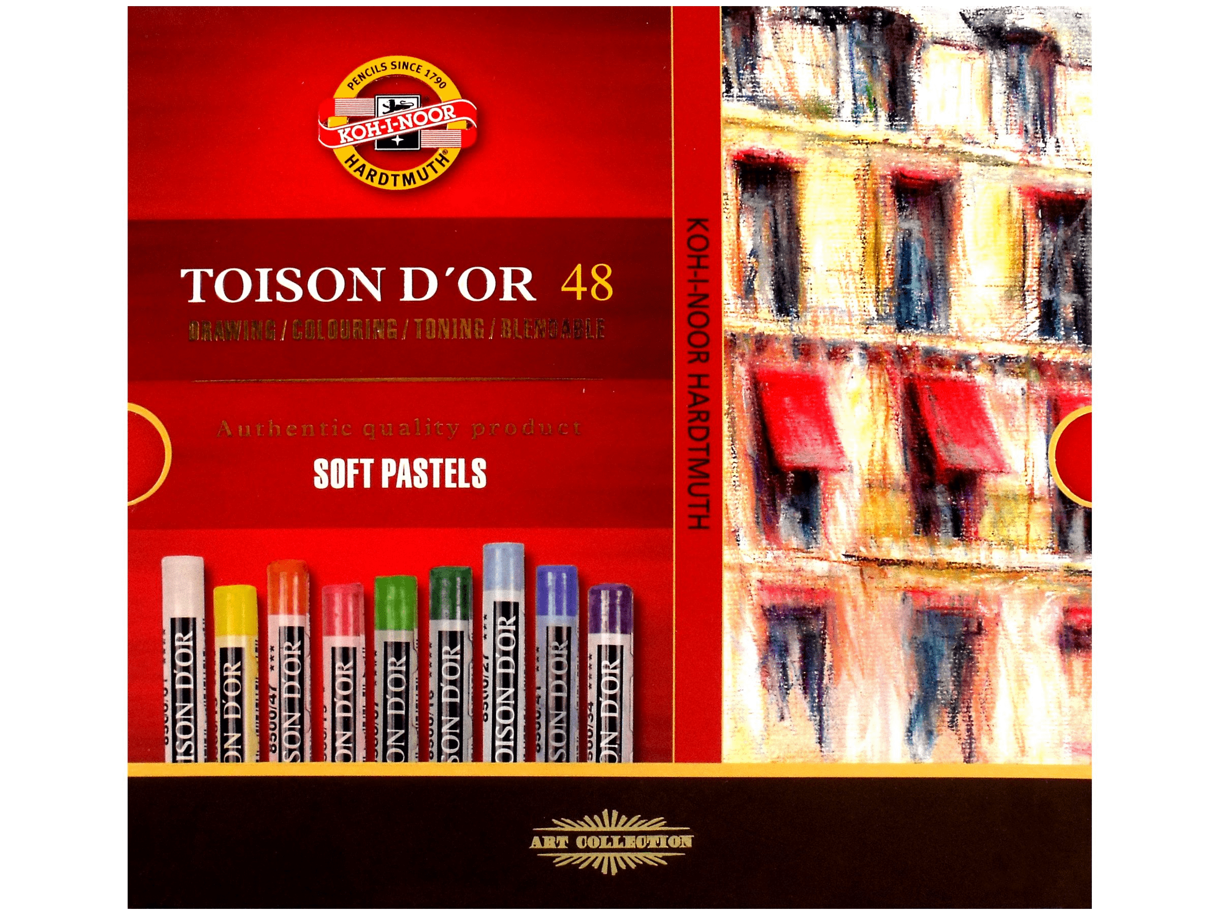 Pastele suche TOISON D'OR odznaczają się paletą trwałych kolorów i jednolitością pigmentu w masie pasteli. Są bardzo kruche i delikatne, dzięki czemu świetnie się rozcierają, a przez co są bardzo podatne na złamania. Do rysowania pastelą zalecane jest używanie papieru z fakturą, gdyż łączy się z podłożem tylko w sposób mechaniczny (mikro zagłębienia w fakturze papieru). Dlatego po ukończeniu pracę należy zabezpieczyć fiksatywą lub przykryć szybą. Komplet 48 kolorów.