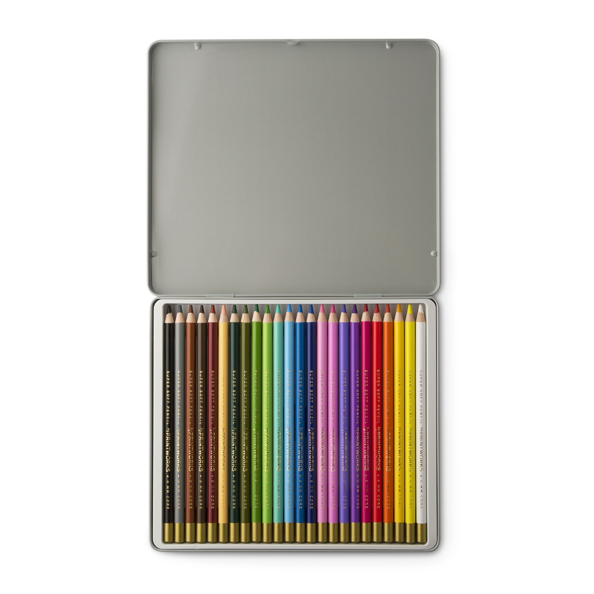 Zestaw 24 starannie dobranych kredek klasycznych kolorach i estetycznym metalowym opakowaniu. Zaprojektowane i wyprodukowane przez PRINTWORKS.