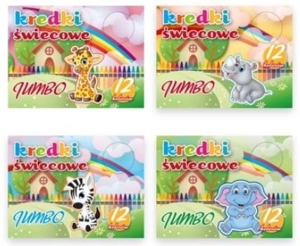 Kredki świecowe 12 kolorów: pomarańczowy, brązowy, granatowy, fioletowy, niebieski, jasny zielony, jasny brąz, czarny, ciemny fioletowy, ciemny zielony, czerwony, żółty.