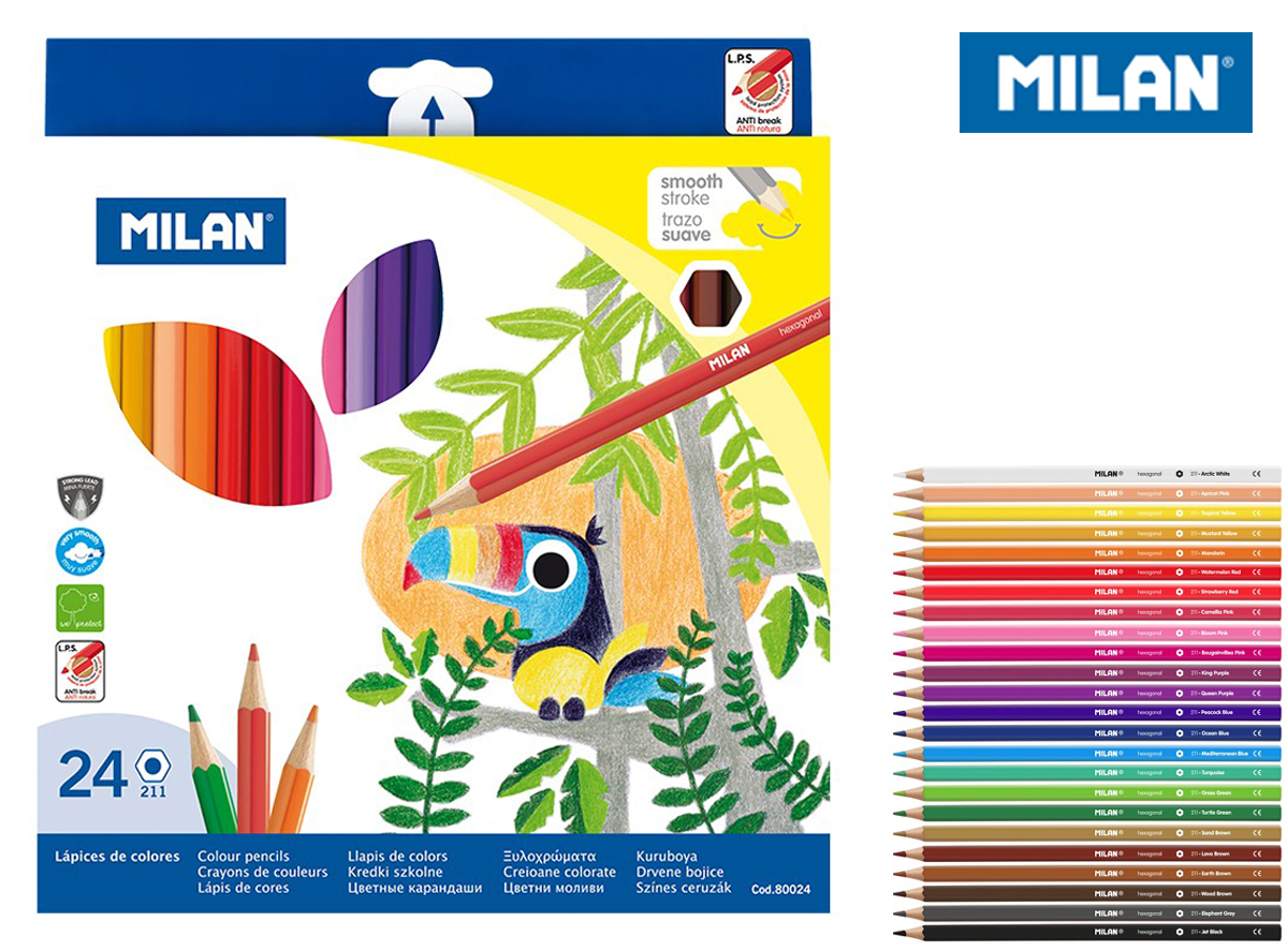 Kredki ołówkowe sześciokątne. System ochrony rysika LPS zwiększający odporność na złamanie.Wysokiej jakości pigmenty w żywych, intensywnych kolorach, odporne na działanie światła. Kreska wykonana kredką MILAN jest miękka, jednolita o wyraźnym odcieniu. Nie tworzy rowków ani nie niszczy papieru.