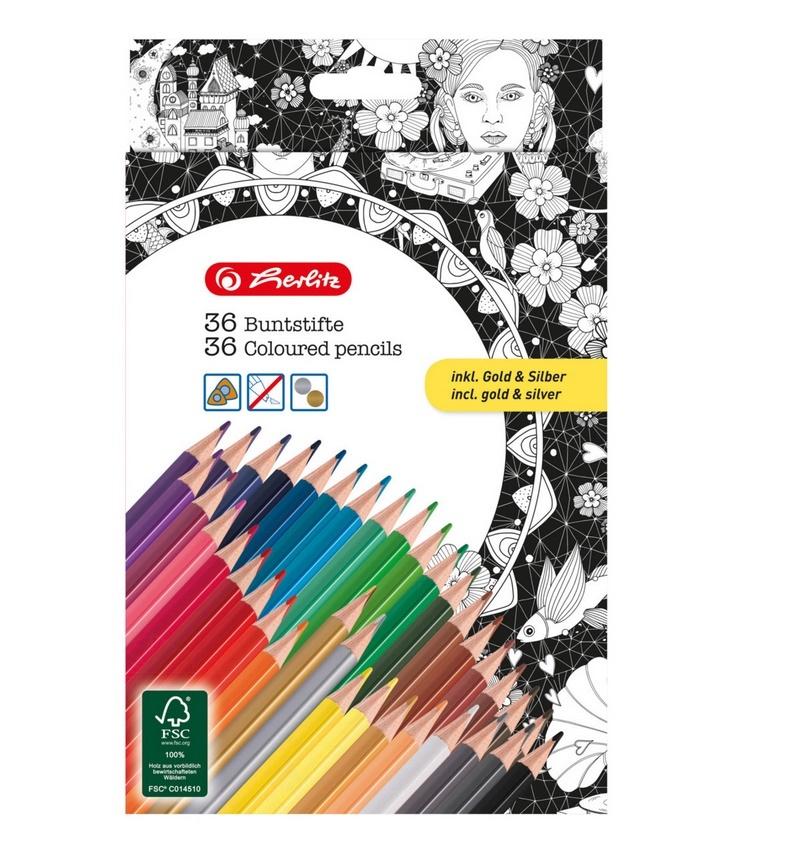 Kredki ołówkowe, trójkątne, do kolorowanek, wykonane z drewna lipowego, lakierowana oprawa ze znakiem FSC®, posiada miękki grafit o intensywnym kolorze. Trójkątny przekrój kredki znacznie ułatwia trzymanie jej w dłoni. Zapobiega także powstawaniu odcisków i deformacji na środkowym palcu. W opakowaniu 36 kredek w tym 1 srebrna i 1 złota.
