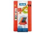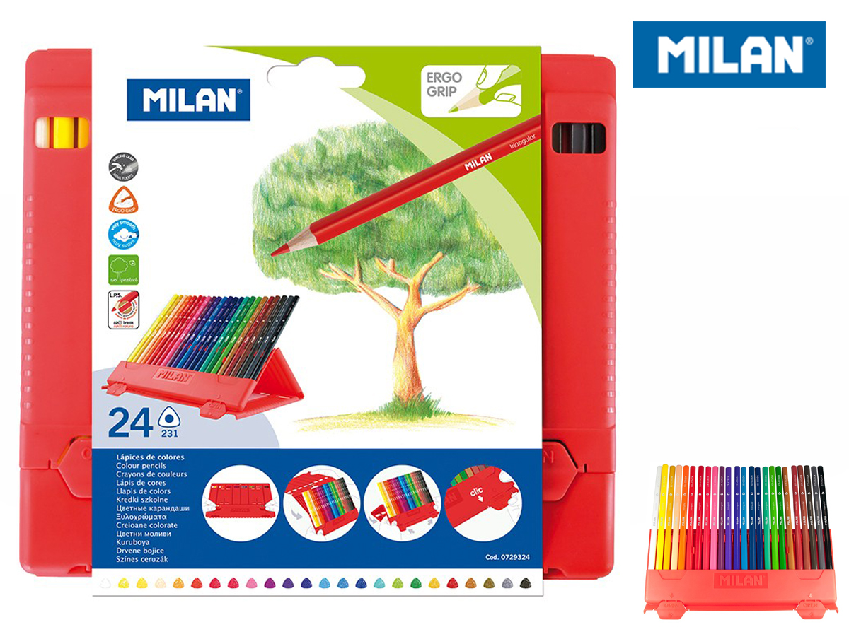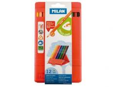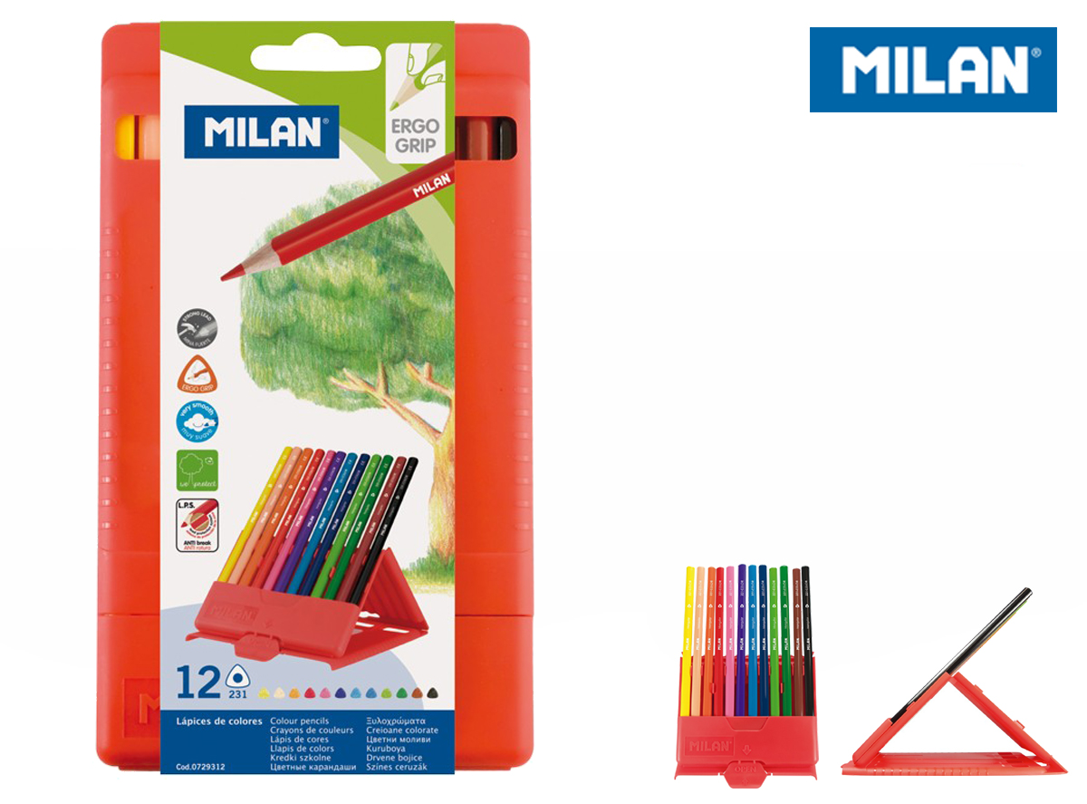 Kredki ołówkowe trójkątne. System ochrony rysika LPS zwiększający odporność na złamanie.Wysokiej jakości pigmenty w żywych, intensywnych kolorach, odporne na działanie światła. Kreska wykonana kredką MILAN jest miękka, jednolita o wyraźnym odcieniu. Nie tworzy rowków ani nie niszczy papieru. 12 kolorów w plastikowym opakowaniu. Po rozłożeniu otrzymujemy przybornik na biurko.