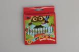 Kredki woskowe - zaostrzone, 12 kolorów. Każda kredka w papierowej owijce chroniącej palce przed zabrudzeniem. Zapakowane w małe kartonowe pudełeczko, z zawieszką na górze. Na pudełeczku nazwa produktu, , kod i inne ważne informacje.