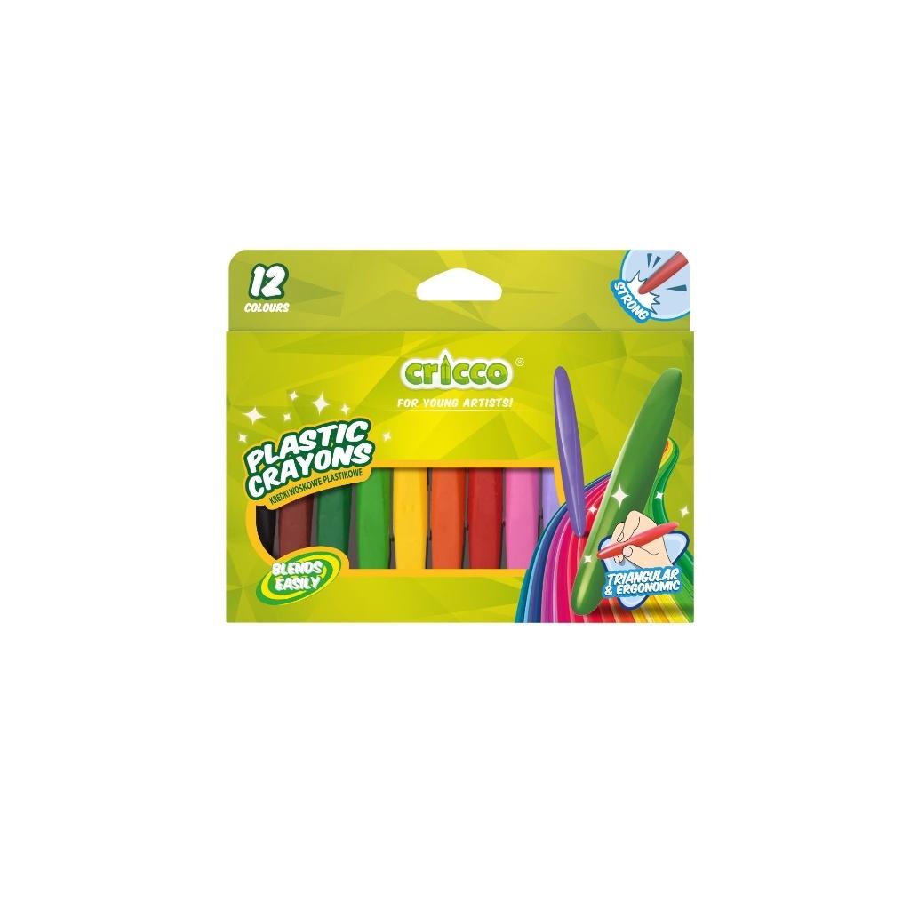 Kredki plastikowe w ergonomicznym, trójkątnym kształcie w 12 intensywnych kolorach. Z plastikową tacką do utrzymania porządku po kolorowaniu. Kredki w kartonowym opakowaniu z zawieszką.