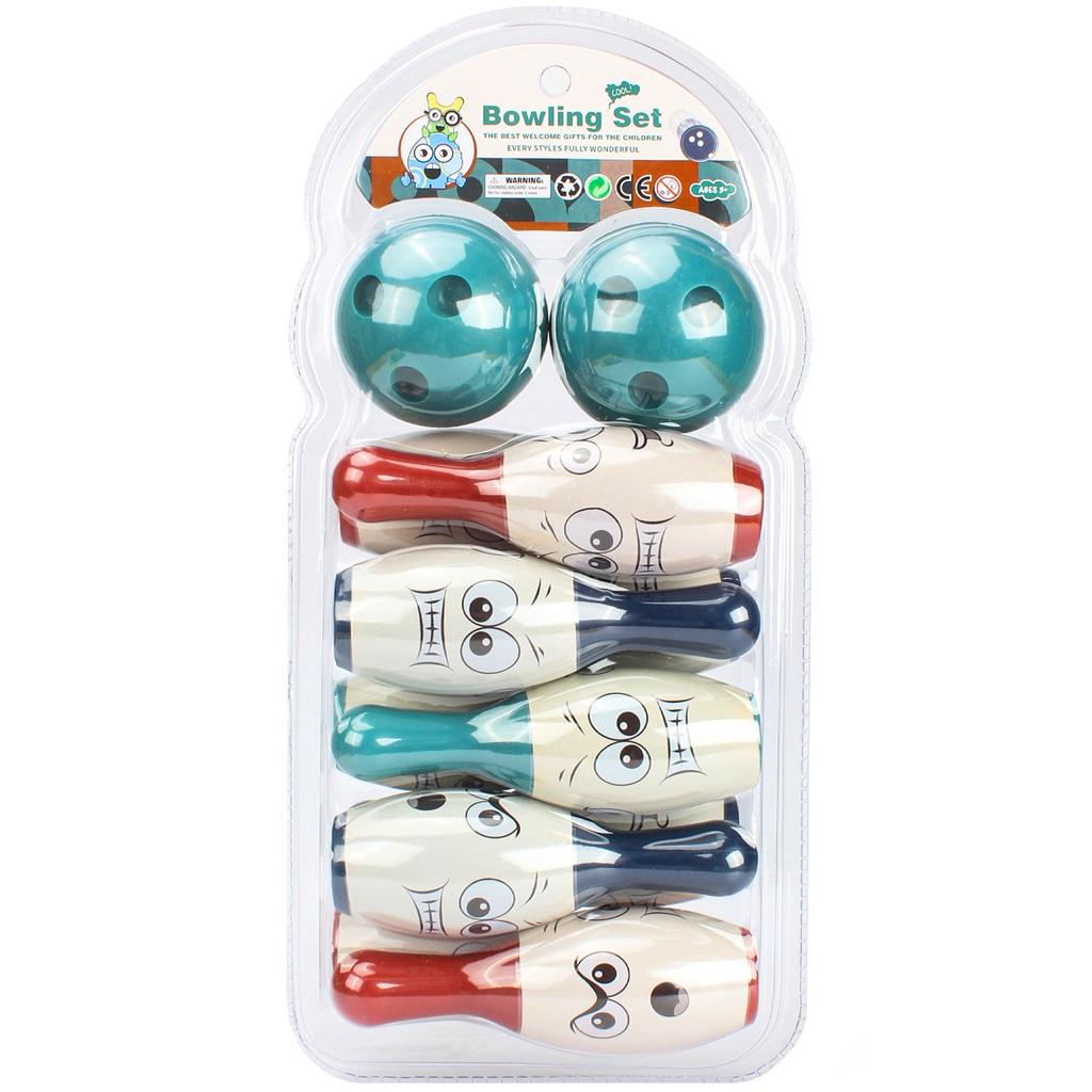 Zestaw kręgli z wizerunkami emotek. W zestawie 10 plastikowych kręgli i 2 kule.