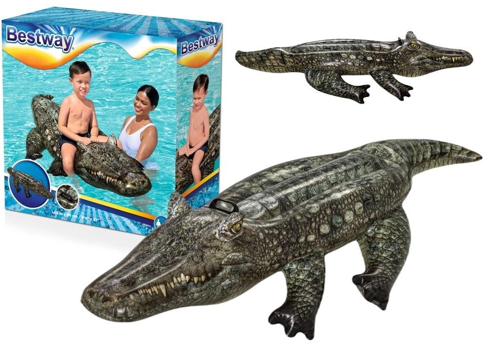 Dmuchany Krokodyl 193 cm x 94 cm Bestway 41478 Dmuchana krokodyl to wspaniały sposób na letni odpoczynek. Piękna kolorystyka oraz niebanalny kształt z pewnością zachwycą najmłodszych i zachęcą do zabawy w wodzie. Krokodyl posiada stabilny uchwyty umiejscowione po dwóch stronach oraz szerokie siedzisko co zapewnia dziecku stabilność oraz wygodę w użytkowaniu. To dmuchane akcesorium do pływania sprawdzi się w każdych warunkach zarówno nad morzem, jeziorem jak i basenie. Jest wykonany z wytrzymałego materiału PVC odpornego na uszkodzenia. Dane techniczne: - Wymiary 193 cm x 94 cm - Materiał PVC - Przeznaczone dla dzieci powyżej 3 roku życia - atrakcyjny wzór krokodyla - mocny uchwyt -stabilny na wodzie - maksymalne obciążenie 45 kg - łatka naprawcza w zestawie Waga: 1,2 kg Wymiary opakowania: 24 cm x 24 cm x 7 cm