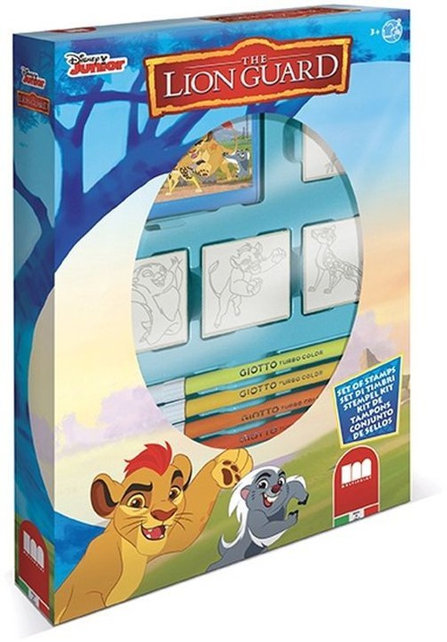 Pieczątki na licencji Króla Lwa. W skład zestawu wchodzą: 4 pieczątki, 1 poduszeczka do tuszu i 7 pisaków.