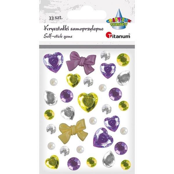 Kryształki samoprzylepne mix wzorów mix kolorów 33 szt. Rodzaj: kokardki 22 x 16 mm, serca 16 x 16 mm, okrągłe 10, 8 mm, łezki 10 x14 mm, perełki 6 mm, tonacja fioletowo-zielona.