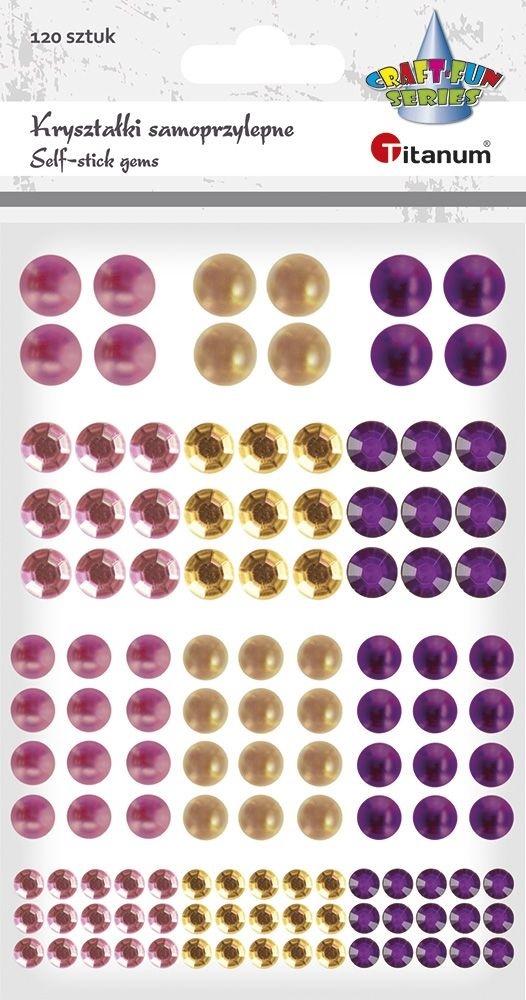 Kryształki i perełki samoprzylepne okrągłe mix perełki 11,5/8mm, kryształki 9,5/6,5mm kolory: perełki - różowy, beżowy, fioletowy, kryształki - różowy, bursztynowy, fioletowy 120szt.