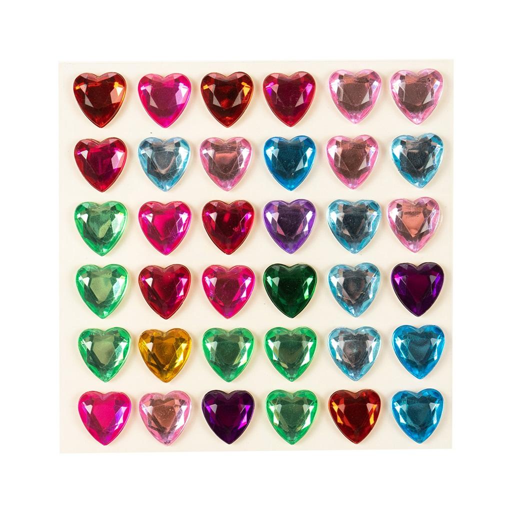 Dekoracyjne kryształki w kształcie kolorowych serduszek. Ozdobne diamenciki samoprzylepne, mix ozdób do prac kreatywnych, szkolnych, dekoracji kartek urodzinowych, zaproszeń, albumów ze zdjęciami, przedmiotów. 36 sztuk na blistrze o wymiarze 8 cm x 8 cm.