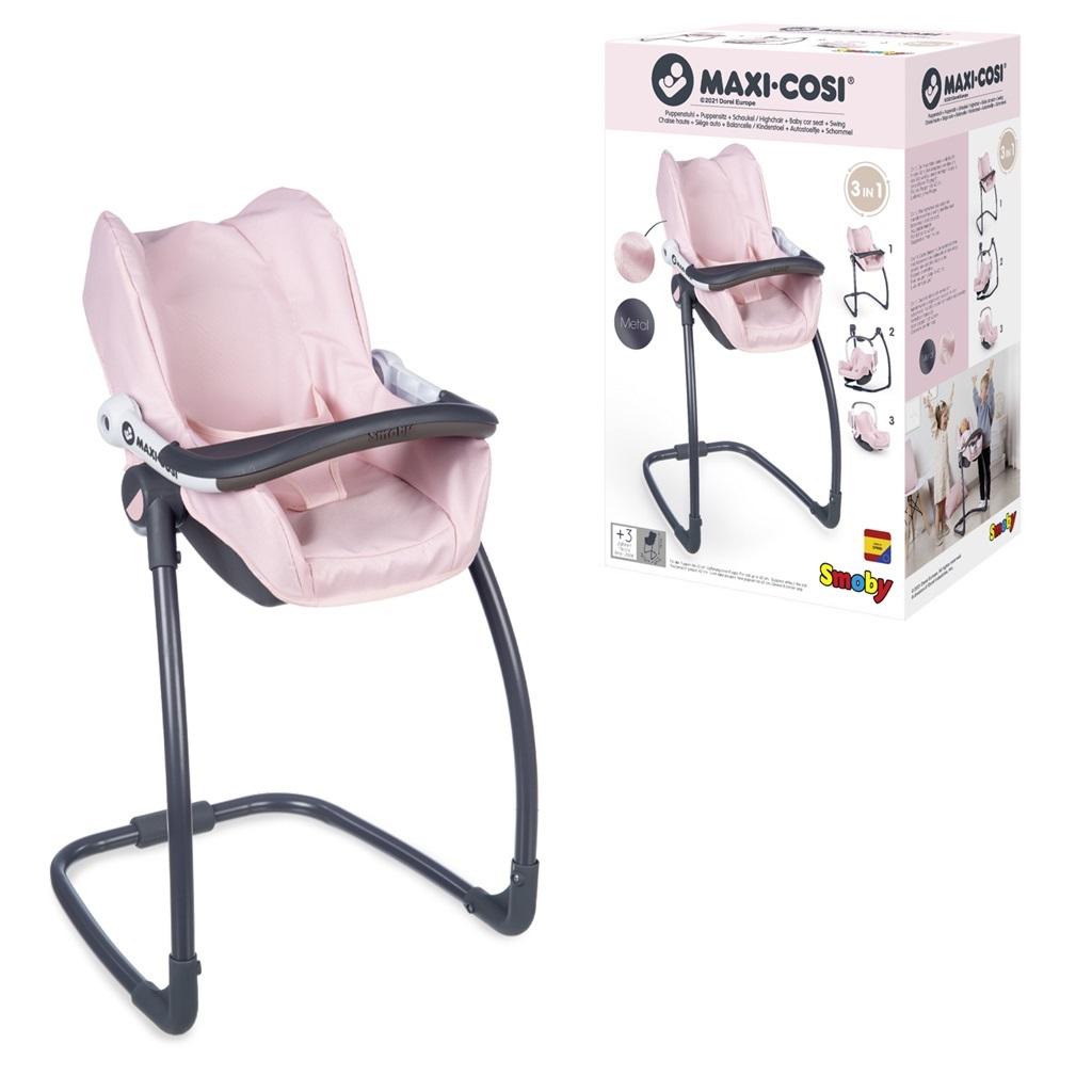 Wysokie krzesełko ze stolikiem, huśtawka oraz fotelik. Dla lalek do 42 cm (brak lalki w zestawie). Wyprodukowany w Hiszpanii. Wymiary: 45 x 41 x 71 cm, 3 l+