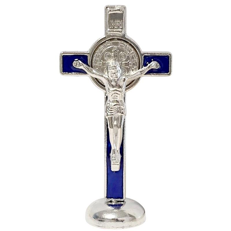 To klasyczny Krzyż Św. Benedykta, znany z silnej symboliki ochronnej i mocy egzorcyzmowania. Wykonano go z trwałego metalu w srebrnym kolorze z wyrazistym niebieskim wypełnieniem. Dodaje to krzyżowi głębi i podkreśla jego sakralny charakter. Niebieski kolor często symbolizuje niebo, wierność i duchową głębię, wprowadzając poczucie spokoju.