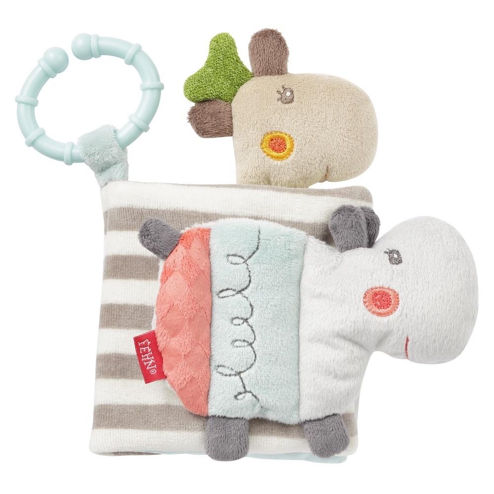 Książeczka Edukacyjna, z Kolekcji: Loopy i Lotta. Miękka i przytulna książeczka, która zabiera dziecko w odkrywczą podróż. Na tytułowej stronie wita nas uśmiechnięty, gruby Hipopotam o imieniu Loopy. Po otwarciu odkrywamy małe lusterko z bezpiecznej folii, domki, drzewka i chudą Żyrafę Lottę, którą można targać za uszy. Dzięki dodatkowemu białemu uchwytowi łatwo możemy zamontować książeczkę przy nosidełku, wózku, lub łóżeczku. Zabawka przeznaczona dla dzieci od najwcześniejszych dni, pobudzająca do chwytania, potrząsania, ściskania. Niezbędna do poznawania świata, wzbudzająca ciekawość, jednym słowem potrzebna zawsze i wszędzie. Każda strona to nowe doświadczenie dla maluszka. Przyjazne w dotyku materiały. Bezpieczne lusterko. Elementy interaktywne takie jak piszczałka, lusterko, szeleszczące kartki i różnorodne faktury materiału stymulują zmysły. Rozwija zdolności motoryczne i manualne. Wszystkie zabawki niemieckiej marki FEHN są bezpieczne dla dzieci od 0 lat. Wykonane są z najlepszej jakości materiałów. Spełniają normy EN71, CE, badane w instytutach ""Stiftung Warentest"" lub ""kotest.