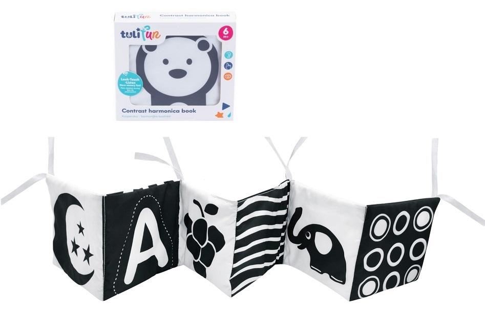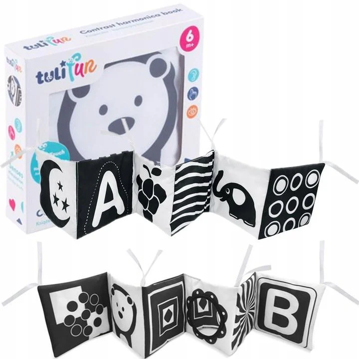 Materiałowa książeczka kryje w sobie wiele kontrastowych obrazków, które stymulują zmysł wzroku malucha. Posiada ona dwie strony do zabawy, a na jednej z nich znajdziemy także ukryte w kwiatku bezpieczne lusterko do samopoznania dziecka. Książeczka - harmonijka wykonana została
