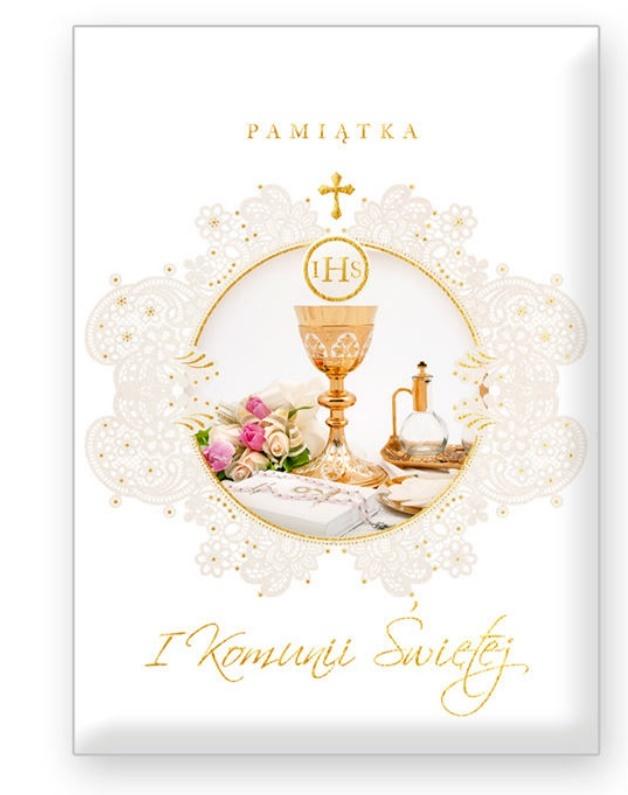 Książeczka okolicznościowa z okazji pierwszej komunii świętej. Twarda okładka ze złotą folią.