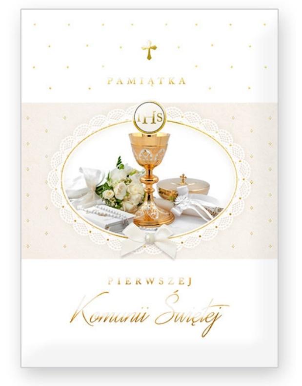 Książeczka okolicznościowa z okazji pierwszej komunii świętej. Twarda okładka ze złotą folią.