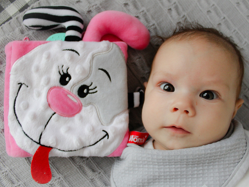 Każda z sześciu stron zawiera inne kształty, a wydobywający sięz zabawki szelest dodatkowo zachęca do jej oglądania.