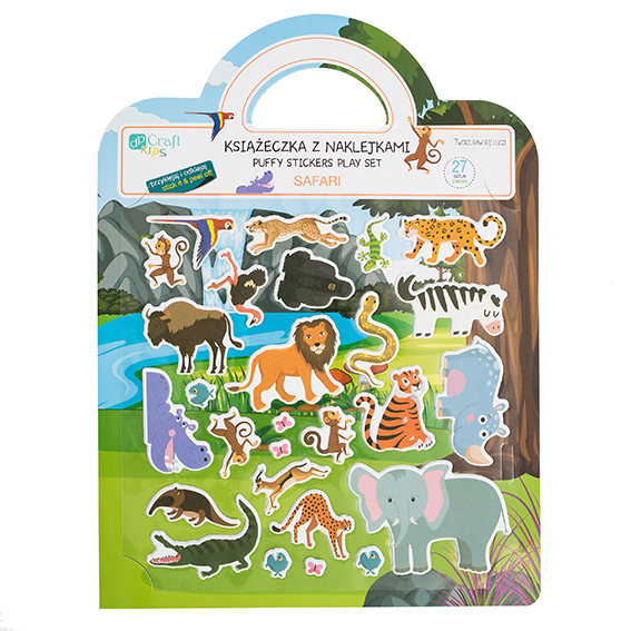 Książeczka z naklejkami to produkt skierowany do dzieci, który pozwala rozwijać kreatywność poprzez budowanie własnych opowieści przy pomocy naklejek. W zestawie znajduje się książeczka z pięknym krajobrazem i gładkim wykończeniem a także 27 naklejek typu puffy z wizerunkami afrykańskich zwierzątek : lwa, żyrafy, słonia, nosorożca czy tygrysa, które można wielokrotnie przyklejać i odklejać. Naklejki mają wypukłą teksturę, co sprawia, że są atrakcyjne w dotyku. Produkt rozwija wyobraźnię dziecka, pozwala na tworzenie różnych scenek oraz ćwiczenie zdolności manualnych i koncentracji.