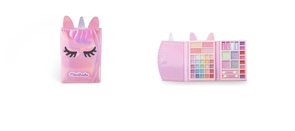 Książka do makijażu dla dzieci "Mały jednorożec". Zestaw zawiera dwadzieścia pięć cieni do powiek, osiem szminek, cztery róże, cztery bronzery i dwa aplikatory.