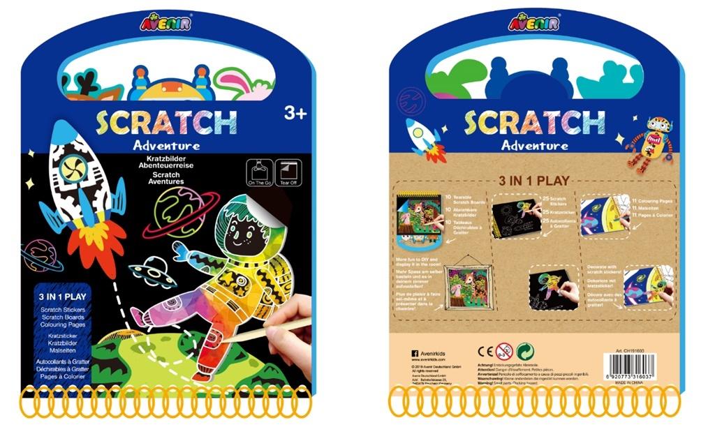 Książeczka z wydrapywankami to ciekawa propozycja dla kreatywnych dzieci. Prosta technika wydrapywania pozwala na stworzenie przepięknych oryginalnych obrazków przy niewielkim nakładzie pracy. Poręczny format książki doskonale sprawdza się, gdy dzieci są w ruchu. Zawiera 25 naklejek do zdrapek przygodowych, 10 zdrapek, 11 stron do kolorowania i drewniany rysik. Zapewnia mnóstwo zabawy dla dzieci.