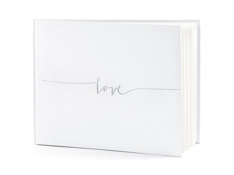 Księga Gości oprawiona papierem w kolorze białym, ze srebrnym napisem Love, wymiary ok. 24 x 18,5 cm, 22 kartki, bez tekstu.