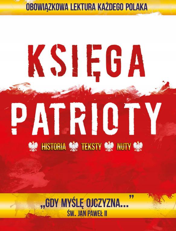 Księga patrioty” to wyjątkowa antologia najpiękniejszych i najbardziej popularnych pieśni patriotycznych: wojskowych, harcerskich, szkolnych. Wśród nich znajdują się takie lubiane i śpiewane przez pokolenia Polaków piosenki jak: „Błękitne rozwińmy sztandary”, „Białe róże”, „Góralu, czy ci nie żal” czy „Idzie żołnierz borem, lasem”. Do każdego tekstu dołączone są linie melodyczne wraz z chwytami gitarowymi, dzięki temu każdy czytelnik będzie miał możliwość samodzielnego poczucia się jak profesjonalny muzyk i samodzielnego wykonania popularnych piosenek. Ponadto każda pieśń została opatrzona unikatowym opisem wyjaśniającym genezę utworu lub nawiązującym do historii naszego kraju. Jest to znakomity sposób do zgłębienia historii Polski, nie tylko tej znanej powszechnie, ale także faktów, które nie przebiły się do świadomości społeczeństwa. Dzięki temu książka popularyzuje zamiłowanie do historii Polski. „Księga patrioty” to publikacja, która promuje polską kulturę. Znajomość dziedzictwa narodowego, a takim bez wątpienia są pieśni patriotyczne, pozwala budować tożsamość każdego Polaka, sprzyja kształtowaniu postaw obywatelskich oraz poczuciu więzi społecznej i solidarności. Wielkim atutem książki jest szata graficzna. Publikacja została zilustrowana obrazami i zdjęciami, które nawiązują do najważniejszych i najbardziej wzruszających momentów z dziejów Polski. Każdy Polak odnajdzie w niej natchnienie i pozytywne emocje. Format książki przygotowany jest z myślą o miłośnikach muzyki. Duży format pozwala na posługiwanie się książką jak profesjonalnym opracowaniem nutowym. Książka jest niczym galeria sztuki zawierająca obrazy przedstawiające najważniejsze wydarzenia z dziejów naszej ojczyzny, a zarazem archiwum zdjęć dokumentujących historię Polski.