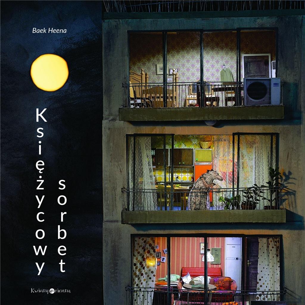 Księżycowy sorbet opowiada historię jednej nocy z życia wilczych mieszkańców kamienicy. Jest ciepła, parna noc, podczas której nagle zaczyna topić się księżyc… Dzięki genialnemu projektowi kamienicy wykonanej przez autorkę, czytelnicy mają możliwość zajrzeć do środka domu niejako przez okno. Perfekcyjna gra świateł doskonale oddaje wrażenie „zaglądania z zewnątrz”. Czytelnik jest świadkiem życia wilczej społeczności. W książce bardzo subtelnie przekazana została koreańska ludowa legenda o królikach zamieszkujących Księżyc. Króliki według niektórych ubijają w moździerzu ryżowe ciasto na ryżowe ciasteczka na Święto Dziękczynienia przypadające na piętnasty dzień ósmego miesiąca księżycowego. Z książki wyłania się jasny przekaz: „Wszyscy jesteśmy sąsiadami. Dotykamy swoich żyć. Czasami czyjś błąd staje się moim nieszczęściem, czasami czyjaś radość staje się moim szczęściem. Jesteśmy jak naczynia połączone”. Baek Heena - Pisarka i ilustratorka, animatorka i lalkarka. Planuje i tworzy scenerię swoich książek, a później ją fotografuje. Historie rozgrywają się w różnym czasie i w różnych przestrzeniach. Książki kipią fantazją, a jednocześnie mają w sobie niezwykłą subtelność. Czytelnicy twierdzą, że dobrze się czytają i zapadają w pamięć. Autorka dba o najmniejszy detal, a jej prace cechuje niezwykły artyzm.