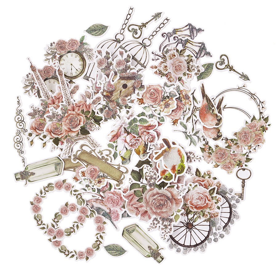 Brokatowe kształty papierowe Love Paris łączą delikatną kolorystykę z motywami w stylu vintage. Znajdziesz wśród nich ptaki, kluczyki, listki, ozdobne wieńce i inne elementy z różami.