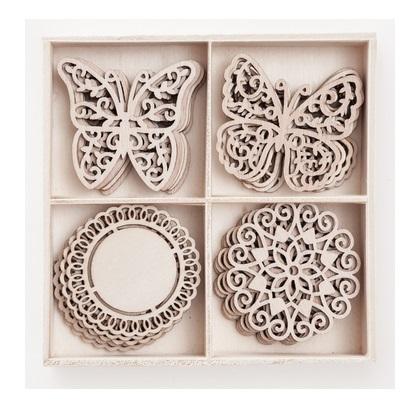 Fantastyczny zestaw kształtów z drewna ala chipboard, które urozmaicą każdy projekt. W drewnianej skrzyneczce znajduje się 20 aplikacji, w tym 4 różne wzory - motyle i ażurowe dekory. Chipboardy to idealny dodatek do wszelkich prac typu cardmaking, scrapbooking, home decor i wielu innych. Drewniane kształty można dowolnie ozdabiać, malować, ozłacać (hot stamping), bądź pozostawić w naturalnej postaci