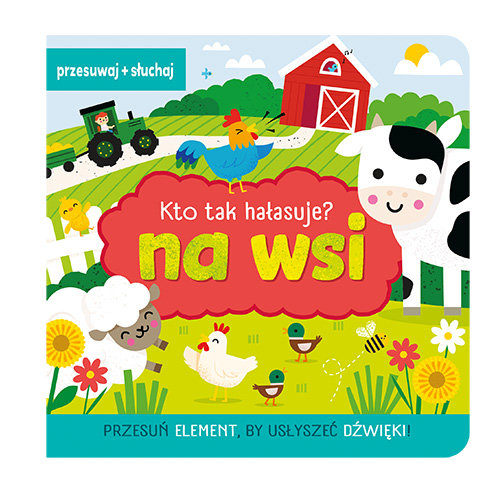 Książeczka z ruchomymi elementami dźwiękowymi– zawiera elementy Dźwiękowe, które maluszek może przesuwać. Wspiera wszechstronny rozwój dziecka – pobudza ZMYSŁY WZROKU, SŁUCHU I DOTYKU, rozwija WYOBRAŹNIĘ PRZESTRZENNĄ. Prezentuje DŹWIĘKI wydawane przez ZWIERZĘTA WIEJSKIE. Zawiera proste i krótkie TEKSTY. Książka zapoznaje dzieci ze zwierzętami mieszkającymi NA WSI. Mali czytelnicy znajdą w niej proste i krótkie TEKSTY. Wyróżnikiem publikacji są PRZESUWANE ELEMENTY DŹWIĘKOWE, dzięki którym dziecko może AKTYWNIE uczestniczyć w czytaniu. Kolorowe ILUSTRACJE pomogą poznawać zwierzęta Książka działa na RÓŻNE ZMYSŁY: WZROK, DOTYK, SŁUCH rozwija WYOBRAŹNIĘ wzbogaca SŁOWNICTWO Kto tak hałasuje? Seria książeczek z PRZESUWANYMI ELEMENTAMI DŹWIĘKOWYMI. Wprowadza w świat zwierząt. Uwagę przyciągają SYMPATYCZNE ILUSTRACJE oraz KRÓTKIE TEKSTY.
